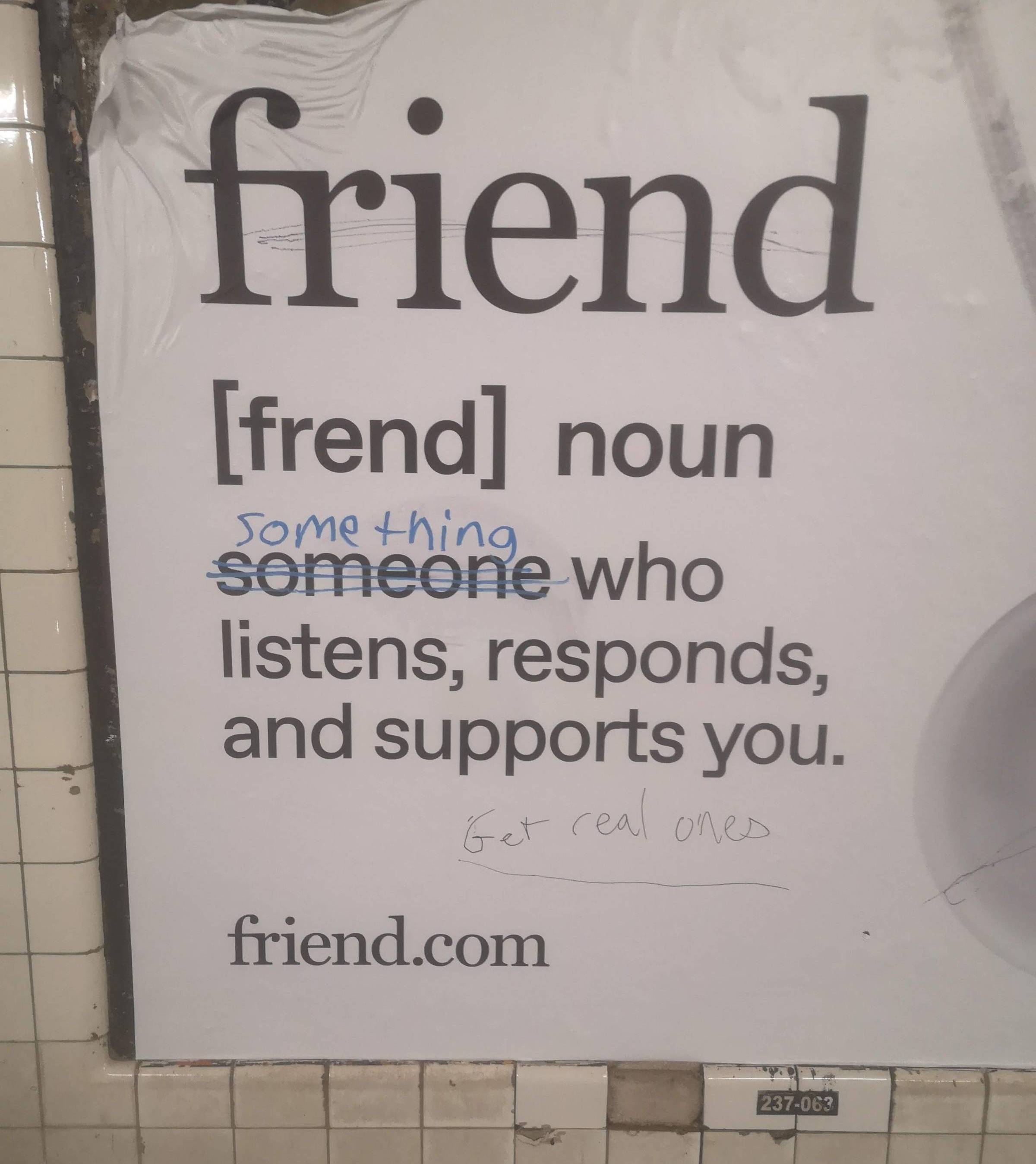 Ah, the New York City subway. It's a cultural microcosm of what's going on in the news, entertainment, and civil society, but with a cynically inauthentic twist genetically modified to mislead the consumer. Like the GLP1 weight loss drug advert featuring Serena Williams injecting herself with some kind of trigger device. If you weren't looking carefully, you might think it was a body-building poster from the gym in Love Lies Bleeding. Meanwhile, the copy on posters recruiting for NYPD and ICE use language that sounds like you're joining a singing circle on an ad-hoc basis. But the most curious advert I saw was nearly colorless. The futuristic monochrome background featured a large, teardrop-shaped grey necklace and proposed a dictionary definition of Friend: "someone who listens, responds, and supports you."